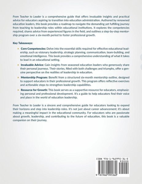 Discover Your Path to Educational Leadership! Introducing the groundbreaking book, "From Teacher To Leader: Paving Your Path To Education Administration," where the key skills to becoming an effective educational leader are unveiled! Unlock Invaluable Advice from Seasoned Leaders Inside this remarkable book, you'll gain access to invaluable advice from experienced leaders in the field, providing unique insights into the world of educational leadership. Whether you're a new principal or dean seeking guidance or an aspiring school leader preparing for an administrator job interview, "From Teacher to Leader" is your ultimate companion on this transformative journey. Embrace the Workbook Approach "At its core, "From Teacher to Leader" adopts a transformative workbook approach, offering reflective questions that guide mentor/mentee pairs towards cultivating essential leadership skills. By delving into the nuts-and-bolts of educational leadership, this book explores critical competencies like budgeting and financial management, change management, collaboration, communication, and more, providing you with the practical tools you need to succeed in any educational leadership role. Your Comprehensive Learning Experience Each section concludes with reflective questions, offering you a comprehensive learning experience that helps you develop your leadership skills step by step. Whether you're a teacher, faculty member, department chair, or institutional leader, "From Teacher to Leader" is your go-to resource for advancing your career and becoming the inspiring leader you were meant to be. Unlock the A-to-Z Pathway to Leadership Excellence Embark on the A-to-Z pathway for navigating your journey to educational leadership, from developing the right attitude and branding yourself as a leader to mastering decision-making, energy management, and the art of resilience. Let "From Teacher to Leader" be your trusted guide to transforming into a successful and influential educational leader, poised to make a lasting impact on your school and students. Overcoming Leadership Uncertainty Transitioning from a teacher to an educational leader can be overwhelming, leaving you uncertain about where to start and how to succeed in your new role. Fear not! This book provides the guidance and support you need to conquer those initial challenges and flourish as a confident and effective leader. Benefits of "From Teacher to Leader" Empowerment: Gain the tools and strategies needed to lead with confidence. Relevance: Stay ahead of the curve by addressing the current challenges faced by educational leaders. Mentorship: Benefit from the wisdom of experienced leaders. Professional Growth: Elevate your career prospects by mastering the essential leadership skills. Impact: Create a lasting impact on your school community and students. Transformation: Embrace the journey of transformation as you evolve from a teacher into a respected and influential educational leader. Seize the Opportunity for Growth Elevate your leadership skills, discover your true purpose, and embrace lifelong learning with "From Teacher to Leader." The path to education administration excellence awaits you! Get ready to embark on an empowering journey that will shape your future and the future of education.