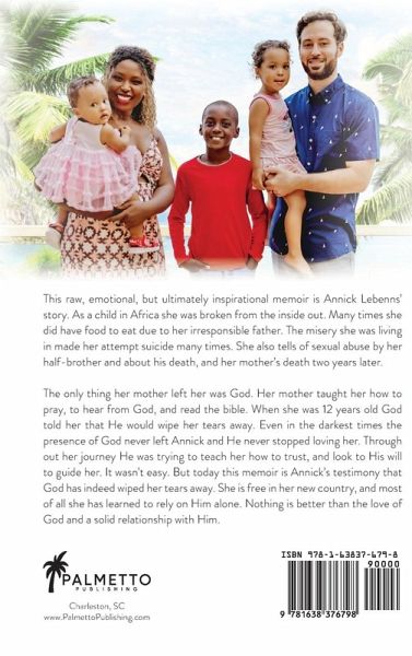 This raw, emotional, but ultimately inspirational memoir is Annick Lebenns' story. As a child in Africa she was broken from the inside out. Many times she did not have food to eat due to her irresponsible father. The misery she was living in made her attempt suicide many times. She also tells of sexual abused by her half-brother and about his death, and her mother's death two years later. The only thing her mother left her was God. Her mother taught her how to pray, to hear from God, and read the bible. When she was 12 years old God told her that He would wipe her tears away. Even in the darkest times the presence of God never left Annick and He never stopped loving her. Through out her journey He was trying to teach her how to trust, and look to His will to guide her. It wasn't easy. But today this memoir is Annick's testimony that God has indeed wiped her tears away. She is free in her new country, and most of all she has learned to rely on Him alone. Nothing is better than the love of God and a solid relationship with Him.