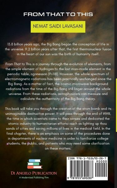 13.8 billion years ago, the Big Bang began the conception of life in the universe. 9.2 billion years after that, the first thermonuclear fusion in the heart of our sun was the birth of humanity itself. From That to This is a journey through the evolution of elements, from the simple element of hydrogen to the last man-made element in the periodic table, oganesson. However, the whole spectrum of electromagnetic radiations has been practically unchanged since the Big Bang. As a matter of fact, the cosmic microwave background radiations from the time of the Big Bang still linger around the whole universe. From these radiations, astrophysicists can measure and calculate the authenticity of the Big Bang theory. This book will take you through the creation of the atom bomb and its unimaginable destructive power. It will pass through the end of WWII, the time in which scientists came to their senses and dedicated the atomic industry to humanitarian efforts-?such as lighting up thousands of cities and saving millions of lives in the medical field. In the final chapter, there is an emphasis on some of the procedures done in departments of nuclear medicine in order to familiarize college students, the public, and patients who may need some clarification on these matters.
