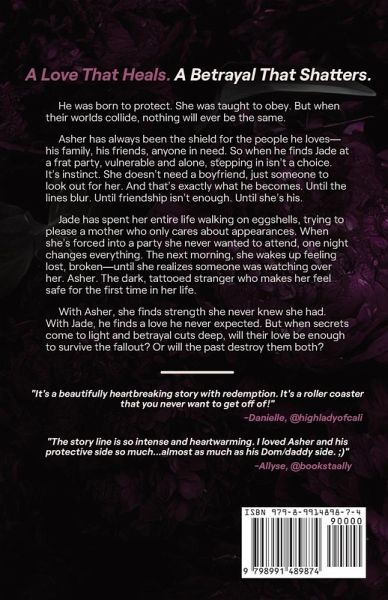 A Love That Heals. A Betrayal That Shatters. He was born to protect. She was taught to obey. But when their worlds collide, nothing will ever be the same. Asher has always been the shield for the people he loves-his family, his friends, anyone in need. So when he finds Jade at a frat party, vulnerable and alone, stepping in isn't a choice. It's instinct. She doesn't need a boyfriend, just someone to look out for her. And that's exactly what he becomes. Until the lines blur. Until friendship isn't enough. Until she's his. Jade has spent her entire life walking on eggshells, trying to please a mother who only cares about appearances. When she's forced into a party she never wanted to attend, one night changes everything. The next morning, she wakes up feeling lost, broken-until she realizes someone was watching over her. Asher. The dark, tattooed stranger who makes her feel safe for the first time in her life. With Asher, she finds strength she never knew she had. With Jade, he finds a love he never expected. But when secrets come to light and betrayal cuts deep, will their love be enough to survive the fallout? Or will the past destroy them both?