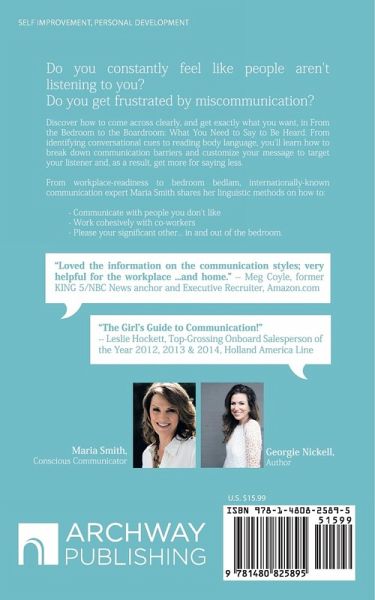 Do you constantly feel like people aren't listening to you? Do you get frustrated by miscommunication? Discover how to come across clearly, and get exactly what you want, in From the Bedroom to the Boardroom: What You Need to Say to Be Heard. From identifying conversational cues to reading body language, you'll learn how to break down communication barriers and customize your message to target your listener and, as a result, get more for saying less. From workplace-readiness to bedroom bedlam, internationally-known communication expert Maria Smith shares her linguistic methods on how to: - Communicate with people you don't like - Work cohesively with co-workers - Please your significant other... in and out of the bedroom. "Loved the information on the communication styles; very helpful for the workplace ...and home." -- Meg Coyle, former KING 5/NBC News anchor and Executive Recruiter, Amazon.com "The Girl's Guide to Communication!" -- Leslie Hockett, Top-Grossing Onboard Salesperson of the Year 2012, 2013 & 2014, Holland America Line