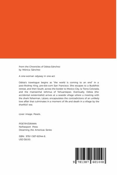 From the Chronicles of Odisia Sánchez by Mónica Sánchez a one-woman odyssey in one-act Odisia's travelogue begins as "the world is coming to an end" in a post-Rodney King, pre-dot-com San Francisco. She escapes to a Buddhist retreat, and then South, across the border to Mexico City, la Tierra Colorado, and the matriarchal Isthmus of Tehuantepec. Eventually, Odisia (the accidental existentialist) arrives at a seaside village where a meeting the shark fisherman, Lázaro, encapsulates the contradictions of an unlikely love affair that culminates in a moment of life and death in a village by the sharkfull sea. This is a NoPassport Press publication.