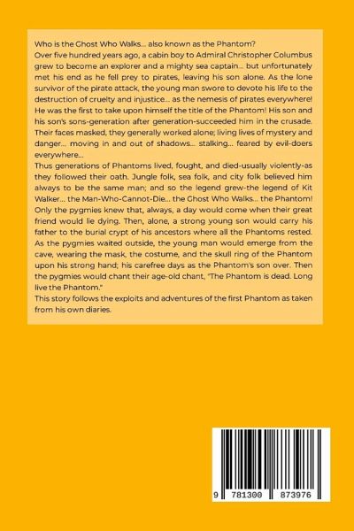 For Those Who Came in Late... Who is the Ghost Who Walks... also known as the Phantom? Over five hundred years ago, a cabin boy to Admiral Christopher Columbus grew to become an explorer and a mighty sea captain... but unfortunately met his end as he fell prey to pirates, leaving his son alone. As the lone survivor of the pirate attack, the young man swore to devote his life to the destruction of cruelty and injustice... as the nemesis of pirates everywhere! He was the first to take upon himself the title of the Phantom! His son and his son's sons-generation after generation-succeeded him in the crusade. Their faces masked, they generally worked alone; living lives of mystery and danger... moving in and out of shadows... stalking... feared by evil-doers everywhere... Thus generations of Phantoms lived, fought, and died-usually violently-as they followed their oath. Jungle folk, sea folk, and city folk believed him always to be the same man; and so the legend grew-the legend of Kit Walker... the Man-Who-Cannot-Die... the Ghost Who Walks... the Phantom! Only the pygmies knew that, always, a day would come when their great friend would lie dying. Then, alone, a strong young son would carry his father to the burial crypt of his ancestors where all the Phantoms rested. As the pygmies waited outside, the young man would emerge from the cave, wearing the mask, the costume, and the skull ring of the Phantom upon his strong hand; his carefree days as the Phantom's son over. Then the pygmies would chant their age-old chant, "The Phantom is dead. Long live the Phantom." This story covers the origin of the First Phantom as told from excerpts in his diaries.