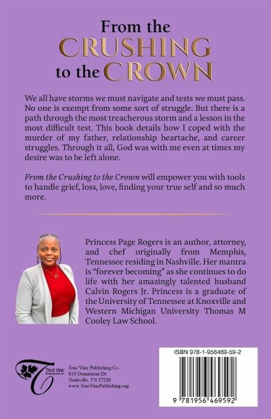 We all have storms we must navigate and tests we must pass. No one is exempt from some sort of struggle. But there is a path through the most treacherous storm an a lesson in the most difficult test. This book details how I coped with the murder of my father, relationship heartache, and career struggles. Through it all God was with me even at times my desire was to be left alone. From the Crushing to the Crown will empower you with tools to handle grief, loss, love, finding your true self and so much more.