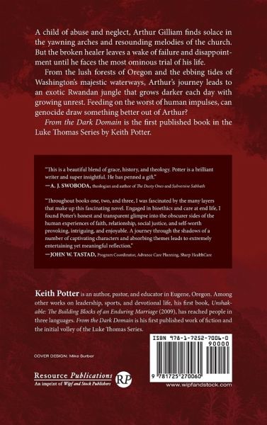 A child of abuse and neglect, Arthur Gilliam finds solace in the yawning arches and resounding melodies of the church. But the broken healer leaves a wake of failure and disappointment until he faces the most ominous trial of his life. From the lush forests of Oregon and the ebbing tides of Washington's majestic waterways, Arthur's journey leads to an exotic Rwandan jungle that grows darker each day with growing unrest. Feeding on the worst of human impulses, can genocide draw something better out of Arthur? From the Dark Domain is the first published book in the Luke Thomas Series by Keith Potter.