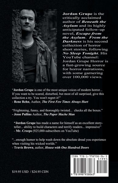 About the Author:Jordan Grupe is the critically acclaimed author of Beneath the Asylum and its highly anticipated follow-up novel, Escape from the Asylum. From the Darkness is his second collection of horror short stories, following No Sleep Tonight, a short horror anthology. His YouTube channel: Jordan Grupe Horror is a fast-growing source for short horror narrations, some of which have garnered over 100,000 views. He is the author of more than 250 short stories, many of which have appeared on popular podcasts and YouTube horror channels internationally.His writings are often shared with a vast audience in the hundreds of thousands via the websites Reddit.com (under profile Jgrupe) and YouTube as well as author website: JordanGrupe.com. The author and his works are also featured on an array of other websites, including amazon.com and other Amazon sites; the websites of other major books retailers and the publisher's website: www.manor-house-publishing.com.From the Darkness. author Jordan Grupe's fourth book and latest collection of scary short stories, is certain to please his growing audience and further establish him as a major writer of psychologically disturbing tales of fear and intrigue.Beneath the Asylum - his breakthrough first novel - drew its inspiration from the author's own experience as a security guard at a psychiatric hospital with a dilapidated, and reportedly haunted, old mansion on its grounds. This would lead to his follow-up second novel Escape from the Asylum, bringing readers deeper into a dark realm of gripping horror.No Sleep Tonight continued the author's tales of horror with his first collection of truly scary short stories. And now we have From the Darkness - his newest collection of outstanding short stories, further entrenching his reputation as a leading writer of gripping horror stories.