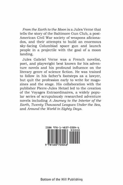 From the Earth to the Moon is a Jules Verne that tells the story of the Baltimore Gun Club, a post-American Civil War society of weapons aficionados, and their attempts to build an enormous sky-facing Columbiad space gun and launch people in a projectile with the goal of a moon landing. Jules Gabriel Verne was a French novelist, poet, and playwright best known for his adventure novels and his profound influence on the literary genre of science fiction. He was trained to follow in his father's footsteps as a lawyer, but quit the profession early to write for magazines and the stage. His collaboration with the publisher Pierre-Jules Hetzel led to the creation of the Voyages Extraordinaires, a widely popular series of scrupulously researched adventure novels including A Journey to the Interior of the Earth, Twenty Thousand Leagues Under the Sea, and Around the World in Eighty Days.