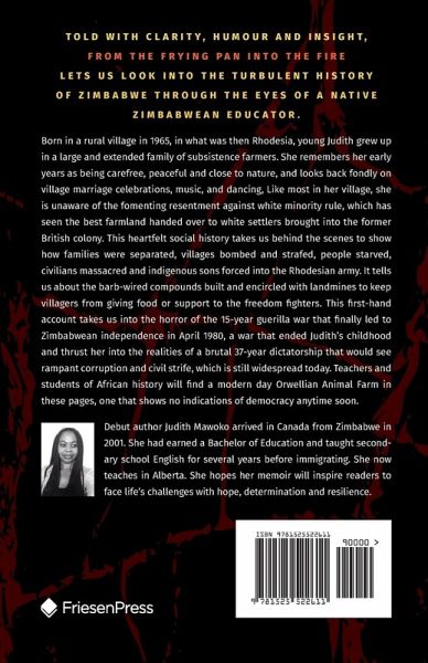 Told with clarity, humour and insight, From the Frying Pan into the Fire lets us look into the turbulent history of Zimbabwe through the eyes of a native Zimbabwean educator. Born in a rural village in 1965, in what was then Rhodesia, young Judith grew up in a large and extended family of subsistence farmers. She remembers her early years as being carefree, peaceful and close to nature, and looks back fondly on village marriage celebrations, music, and dancing. Like most in her village, she is unaware of the fomenting resentment against white minority rule, which has seen the best farmland handed over to white settlers brought into the former British colony. This heartfelt social history takes us behind the scenes to show how families were separated, villages bombed and strafed, people starved, civilians massacred and indigenous sons forced into the Rhodesian army. It tells us about the barb-wired compounds built and encircled with landmines to keep villagers from giving food or support to the freedom fighters. This first-hand account takes us into the horror of the 15-year guerilla war that finally led to Zimbabwean independence in April 1980, a war that ended Judith's childhood and thrust her into the realities of a brutal 37-year dictatorship that would see rampant corruption and civil strife, which is still widespread today. Teachers and students of African history will find a modern day Orwellian Animal Farm in these pages, one that shows no indications of democracy anytime soon....