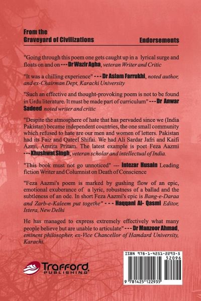 "Islam's Bloody Borders" (Chapter 10 , The Clash of Civilizations, Samuel P. Huntington) is what provoked noted Pakistani poet, writer and literary activist Feza Aazmi to write From The Graveyard of Civilizations giving an equally acerbic and angry rejoinder "Christianity's Bloody Borders" to Huntington. Feza Aazmi's book is an attempt to prove that most wars in the past history were essentially wars of aggrandizement .These were waged for hegemony and for control of resources. The future wars are not going to be any different. In Aazmi's view Prof Huntington's book is a gross misinterpretation of facts of history and present day ground realities. Aazmi detects a distinct intent in the book to malign Islamic faith and history in order to provide an excuse to launch actions against Muslim nations, and to develop a new pattern of hegemony over them. Refuting the basic elements contained in the theory of Clash of Civilizations Aazmi offers a viable alternative of a global society living in peace and security - "this is the paradise, promised on earth, for every living soul", concludes Aazmi. All this is expressed in the format of a book-length verse which is unique in many ways.