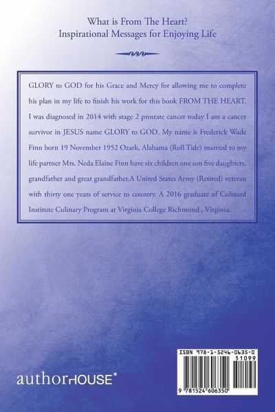 What is From the Heart: Inspirational Messages for Readers in Enjoying Life? First, glory to God for his grace and mercy for allowing me to complete his plan in my life to finish his work for this book from the heart. I was diagnosed in 2014 with stage 2 prostate cancer. Today I am a cancer survivor, in Jesus's name, glory to God. My name is Frederick Wade Finn, born on November 19, 1952, in Ozark, Alabama (Roll Tide). I am married to my life partner, Mrs. Neda Elaine Finn. We have six children, one son and five daughters. I am a grandfather and great-grandfather. I am a United States Army veteran (retired) with thirty-one years of service to country. I am a 2016 graduate of Culinard Institute Culinary Program at Virginia College Richmond, Virginia.