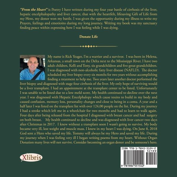 "From the Heart" is Poetry I have written during my four year battle of cirrhosis of the liver, hepatic encelphalopathy and liver cancer, that with the heartfelt, lifesaving Gift of Life from my Hero, my donor won my battle. I was given the opportunity during my illness to write my Prayers, feelings and emotioins during my long journey. Writing my book was my sanctuary finding peace within expressing how I was feeling while I was dying. Donate Life