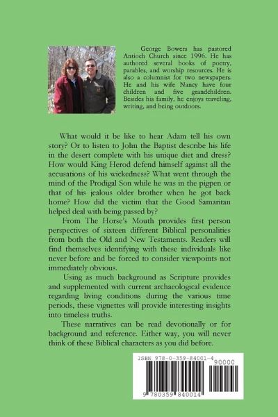 This is a collection of first person narratives that provide insight into sixteen Biblical characters including John the Baptist, John the Apostle, Adam, Simon Peter, King Herod, Gideon, Joseph, The Prodigal Son, The Prodigal Son's Brother, The Victim in the Good Samaritan, and more.