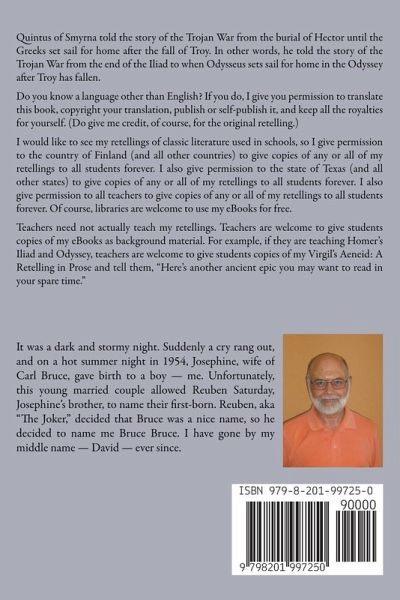 Quintus of Smyrna told the story of the Trojan War from the burial of Hector until the Greeks set sail for home after the fall of Troy. In other words, he told the story of the Trojan War from the end of the Iliad to when Odysseus sets sail for home in the Odyssey after Troy has fallen. Do you know a language other than English? If you do, I give you permission to translate this book, copyright your translation, publish or self-publish it, and keep all the royalties for yourself. (Do give me credit, of course, for the original retelling.) I would like to see my retellings of classic literature used in schools. Teachers need not actually teach my retellings. Teachers are welcome to give students copies of my eBooks as background material. For example, if they are teaching Homer's Iliad and Odyssey, teachers are welcome to give students copies of my Virgil's Aeneid: A Retelling in Prose and tell students, "Here's another ancient epic you may want to read in your spare time."