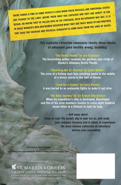 A harrowing collection of true tales of death and survival under the most extreme conditions imaginable There comes a time in some men's lives when their physical and emotional states are pushed to the limit. Maybe their boat has capsized and they are adrift in the ocean, or maybe they've fallen into an ice crevasse, with no apparent way out. It is in these moments men discover what they are truly made of and whether they have the courage and physical strength to come back From the Jaws of Death. This explosive collection showcases twenty-three stories of adventure gone horribly wrong, including: --"The Devil's Thumb" by Jon Krakauer: the bestselling author recounts his perilous solo climb of Alaska's infamous Devil's Thumb --"Surviving the St. Patrick" by Spike Walker: the crew of a fishing boat face crushing waves in the middle of a winter storm in the Gulf of Alaska --"Look for a Corpse" by Larry Kaniut: a man buried by an avalanche fights to make it out alive --"The Boat Journey" by Sir Ernest Shackleton: when his expedition's ship is destroyed, Shackleton and five of his crewmembers resolve to cross 800 ocean miles in a lifeboat to look for help --And many more! This is one of the finest and most extreme collections of true adventure ever assembled.