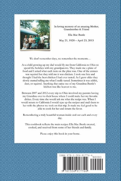 We don't remember days, we remember the moments... Remembering a truly beautiful woman inside and out each and every day. This cookbook reflects the main recipes Ella Mae Bustle created, cooked, and received from some of her friends and family. Please enjoy this book in your home.