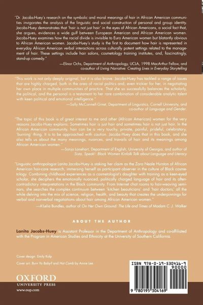 When is hair "just hair" and when is it not "just hair"? Documenting the politics of African American women's hair, this multi-sited linguistic ethnography explores everyday interaction in beauty parlors, Internet discussions, comedy clubs, and other contexts to illuminate how and why hair matters in African American women's day-to-day experiences.