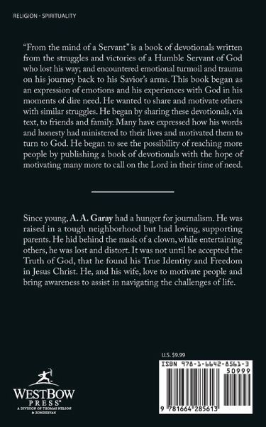 "From the mind of a Servant" is a book of devotionals written from the struggles and victories of a Humble Servant of God who lost his way; and encountered emotional turmoil and trauma on his journey back to his Savior's arms. This book began as an expression of emotions and his experiences with God in his moments of dire need. He wanted to share and motivate others with similar struggles. He began by sharing these devotionals, via text, to friends and family. Many have expressed how his words and honesty had ministered to their lives and motivated them to turn to God. He began to see the possibility of reaching more people by publishing a book of devotionals with the hope of motivating many more to call on the Lord in their time of need.