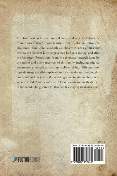 This historical book, based on real events and persons, follows the tumultuous journey of one family--that of John and Elizabeth Holloway--from colonial South Carolina to North Carolina and then to the Natchez District governed by Spain before, during, and after the American Revolution. From the extensive research done by the author and other ancestors of this family, including original documents preserved at the state archives of four different state capitals, many plausible explanations for mysteries surrounding this family and others involved, including some infamous characters, are uncovered. Also included are relevant events and methods used in the decades-long search for this family's story by their ancestors.