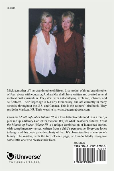 From the Mouths of Babes Volume III, is a love letter to childhood. It is a tonic, a pick me up, a literary Geritol for the soul. It's just what the doctor ordered. From the Mouths of Babes Volume III is a unique combination of humorous stories, with complimentary verses, written from a child's perspective. Everyone loves to laugh and this book provides plenty of that. It's characters live in everyone's family. The readers, with the turn of each page, will undoubtedly recognize some little one who blesses their lives.