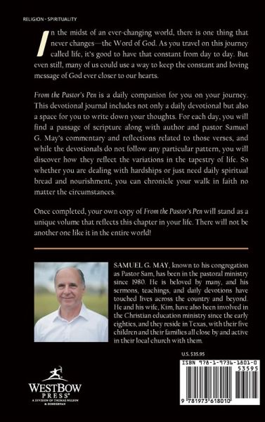 In the midst of an ever-changing world, there is one thing that never changesthe Word of God. As you travel on this journey called life, its good to have that constant from day to day. But even still, many of us could use a way to keep the constant and loving message of God ever closer to our hearts. From the Pastors Pen is a daily companion for you on your journey. This devotional journal includes not only a daily devotional but also a space for you to write down your thoughts. For each day, you will find a passage of scripture along with author and pastor Samuel G. Mays commentary and reflections related to those verses, and while the devotionals do not follow any particular pattern, you will discover how they reflect the variations in the tapestry of life. So whether you are dealing with hardships or just need daily spiritual bread and nourishment, you can chronicle your walk in faith no matter the circumstances. Once completed, your own copy of From the Pastors Pen will stand as a unique volume that reflects this chapter in your life. There will not be another one like it in the entire world!