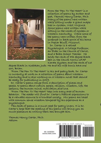 From the Pen To The Heart is a collection of poems by author and poet, Thomas Henry Carter. The poems range from a description of places and people, to poems about nature, people, religion, wisdom, life, the seasons, the human mind, motivation, and love. The reader will find Dr. Carter's poetical expressions to be a valuable resourde to a troubled society. His poems are laced with common sense wisdom tempered by his experience as a psychologist.