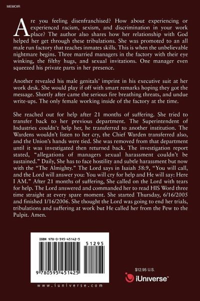 Are you feeling disenfranchised? How about experiencing or experienced racism, sexism, and discrimination in your work place? The author also shares how her relationship with God helped her get through these tribulations. She was promoted to an all male run factory that teaches inmates skills. This is when the unbelievable nightmare begins. Three married managers in the factory with their eye winking, the filthy hugs, and sexual invitations. One manager even squeezed his private parts in her presence. Another revealed his male genitals' imprint in his executive suit at her work desk. She would play if off with smart remarks hoping they got the message. Shortly after came the serious fire breathing threats, and undue write-ups. The only female working inside of the factory at the time. She reached out for help after 21 months of suffering. She tried to transfer back to her previous department. The Superintendent of Industries couldn't help her, he transferred to another institution. The Wardens wouldn't listen to her cry, the Chief Warden transferred also, and the Union's hands were tied. She was removed from that department until it was investigated then returned back. The investigation report stated, "allegations of managers sexual harassment couldn't be sustained." Daily, She has to face hostility and subtle harassment but now with the "The Almighty." The Lord says in Isaiah 58:9, "You will call, and the Lord will answer you: You will cry for help and He will say: Here I AM." After 21 months of suffering, She called on the Lord with tears for help. The Lord answered and commanded her to read HIS Word three time straight at every spare moment. She started Thursday, 6/16/2005 and finished 1/16/2006. She thought the Lord was going to end her trials, tribulations and suffering at work but He called her from the Pew to the Pulpit. Amen.