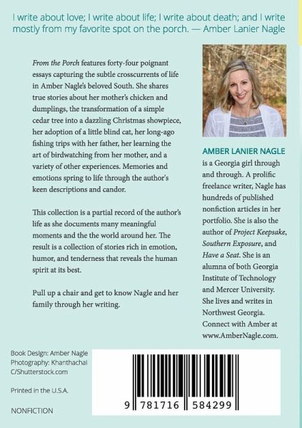 From the Porch features forty-four poignant essays capturing the subtle crosscurrents of life in Amber Nagle's beloved South. She shares true stories about her mother's chicken and dumplings, the transformation of a simple cedar tree into a dazzling Christmas showpiece, her adoption of a little blind cat, her long-ago fishing trips with her father, her learning the art of birdwatching from her mother, and a variety of other experiences. Memories and emotions spring to life through the author's keen descriptions and candor. This collection is a partial record of the author's life as she documents many meaningful moments and the the world around her. The result is a collection of stories rich in emotion, humor, and tenderness that reveals the human spirit at its best. Pull up a chair and get to know Nagle and her family through her writing.