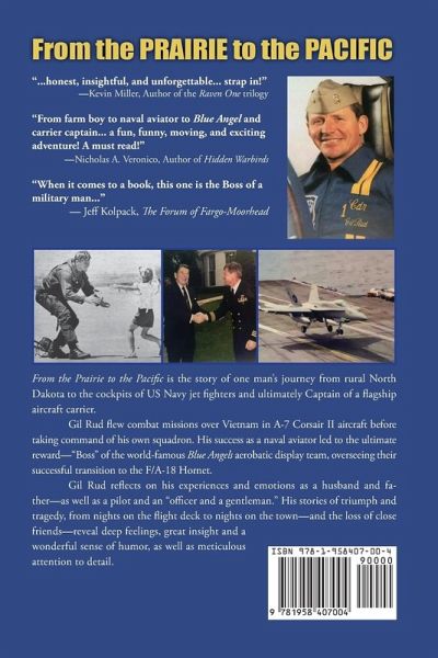 From the Prairie to the Pacific is the story of one man's journey from rural North Dakota to the cockpits of U.S. Navy jet fighters and ultimately Captain of a flagship aircraft carrier. Gil Rud flew combat missions over Vietnam in A-7 Corsair II aircraft before taking command of his own squadron. His success as a Naval aviator led to the ultimate reward - "Boss" of the world-famous Blue Angels aerobatic display team, overseeing their successful transition to the F/A-18 Hornet. Gil Rud reflects on his experiences and emotions as a husband and father as well as a pilot and an "officer and a gentleman." His stories of triumph and tragedy, from nights on the flight deck to nights on the town and the loss of close friends, reveal deep feelings, great insight and a wonderful sense of humor, as well as meticulous attention to detail.