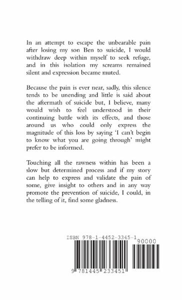 In an attempt to escape the unbearable pain after losing my son Ben to suicide, I would withdraw deep within myself to seek refuge, and in this isolation my screams remained silent and expression became muted. Because the pain is ever near, sadly, this silence tends to be unending and little is said about the aftermath of suicide but, I believe, many would wish to feel understood in their continuing battle with its effects, and those around us who could only express the magnitude of this loss by saying 'I can't begin to know what you are going through' might prefer to be informed. Touching all the rawness within has been a slow but determined process and if my story can help to express and validate the pain of some, give insight to others and in any way promote the prevention of suicide, I could, in the telling of it, find some gladness.