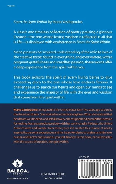 From the Spirit Within by Maria Vasilopoulos A classic and timeless collection of poetry praising a glorious Creator-the one whose loving wisdom is reflected in all that is life-is displayed with exuberance in From the Spirit Within. Maria presents her inspired understanding of the infinite love of the creative forces found in everything and everywhere, with a poignant gratefulness and steadfast passion, these words offer a deep experience from the spirit within you. This book exhorts the spirit of every living being to give exceeding glory to the one whose love endures forever. It challenges us to search our hearts and open our minds to see and experience the majesty of life with the eyes and wisdom that come from the spirit within.