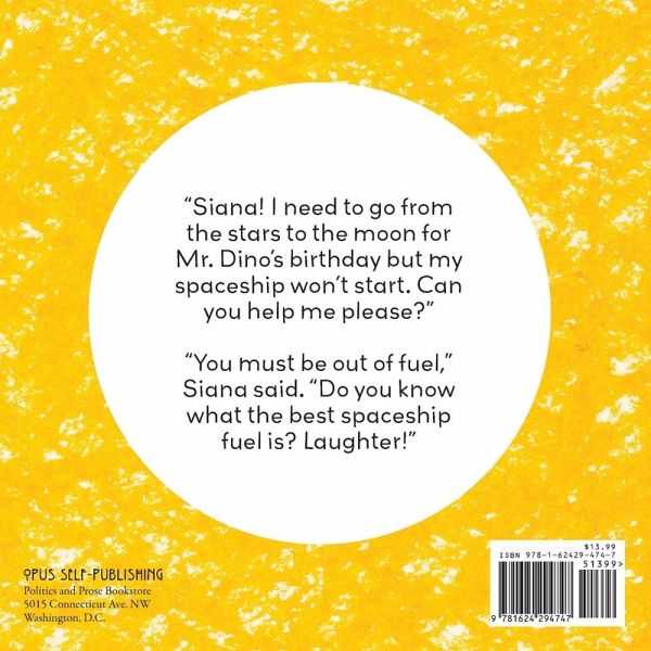 Mr. Dragon had a problem. He had to travel from the Stars to the Moon for Mr. Dino's birthday party. But his spaceship would not start. He jiggled the whatsit. He turned the whatnot. He kicked the thingamabob. But nothing would get the ship to start. Travel from the stars to the moon as Siana and her friends help Mr. Dragon fix his spaceship with the best fuel of all: laughter.