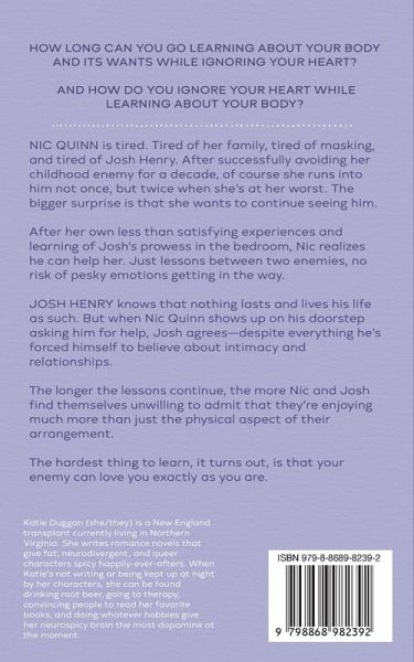 How long can you go learning about your body and its wants while ignoring your heart? And how do you ignore your heart while learning about your body? Nic Quinn is tired. Tired of her family, tired of masking, and tired of Josh Henry. After successfully avoiding her childhood enemy for a decade, of course she runs into him not once, but twice when she's at her worst. The bigger surprise is that she wants to continue seeing him. After her own less than satisfying experiences and learning of Josh's prowess in the bedroom, Nic realizes he can help her. Just lessons between two enemies, no risk of pesky emotions getting in the way. Josh Henry knows that nothing lasts, and lives his life as such. But when Nic Quinn shows up on his doorstep asking him for help, Josh agrees-despite everything he's forced himself to believe about intimacy and relationships. The longer the lessons continue, the more Nic and Josh find themselves unwilling to admit that they're enjoying much more than just the physical aspect of their arrangement. The hardest thing to learn, it turns out, is that your enemy can love you exactly as you are.
