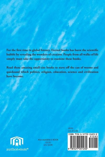 For the first time in global history, Eternal books has burst the scientific bubble by revealing the wonders of creation. People from all walks of life simply must take the opportunity to examine these books. Read these amazing small-size books to stave off the can of worms and quicksand which politics, religion, education, science and civilization have become.