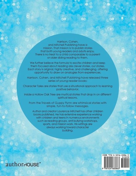 Harrison, Cohen, and Mitchell Publishing have a mission. That mission is to publish stories that both young readers and adults enjoy. There is no treat to a child comparable to a parent or older sibling reading to them. We further believe the formula to excite children and keep them focused about reading are clever stories, our stories. Each story is original, highly creative, and challenging, offering opportunity to draw on analogies from experiences. Harrison, Cohen, and Mitchell Publishing have released three series of young reader books: Character Tales are stories that use a situational approach to learning positive behavior. Inside a Hollow Oak Tree are mystical stories that drop in on different spiritual lessons. From the Travels of Guppy Flynn are whimsical stories with simple, fun-to-follow messages.