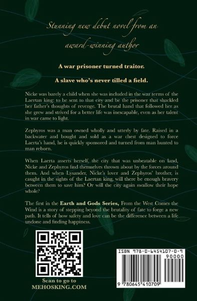 A war prisoner turned traitor. A slave who's never tilled a field. Nicke was barely a child when she was included in the war terms of the Laertan king: to be sent to that city and be the prisoner that shackled her father's thoughts of revenge. The brutal hand that followed her as she grew and strived for a better life was inescapable, even as her talent in war came to light. Zephyros was a man owned wholly and utterly by fate. Raised in a backwater and bought and sold as a war chest designed to force Laerta's hand, he is quickly sponsored and turned from man hunted to man reborn. When Laerta asserts herself, the city that was unbeatable on land, Nicke and Zephyros find themselves thrown about by the forces around them. And when Lysander, Nicke's lover and Zephyros' brother, is caught in the sights of the Laertan king, will there be enough bravery between them to save him? Or will the city again swallow their hope whole? The first in the Earth and Gods Series, From the West Comes the Wind is a story of stepping beyond the brutality of fate to forge a new path. It tells of how safety and love can be the difference between a life undone and finding happiness.