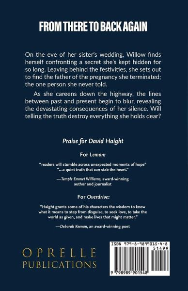 On the eve of her sister's wedding, Willow finds herself confronting a secret she's kept hidden for so long. Leaving behind the festivities, she sets out to find the father of the pregnancy she terminated; the one person she never told. As she careens down the highway, the lines between past and present begin to blur, revealing the devastating consequences of her silence. Will telling the truth destroy everything she holds dear? "A powerful book about the strength it takes to confront and sit in your truth." D.C. Praise for David Haight For Lemon "readers will stumble across unexpected moments of hope" "...a quiet truth that can stab the heart." -Temple Emmet Williams, award-winning author and journalist For Overdrive "Haight grants some of his characters the wisdom to know what it means to step from disguise, to seek love, to take the world as given, and make lives that might matter." -Deborah Keenan an award-winning poet