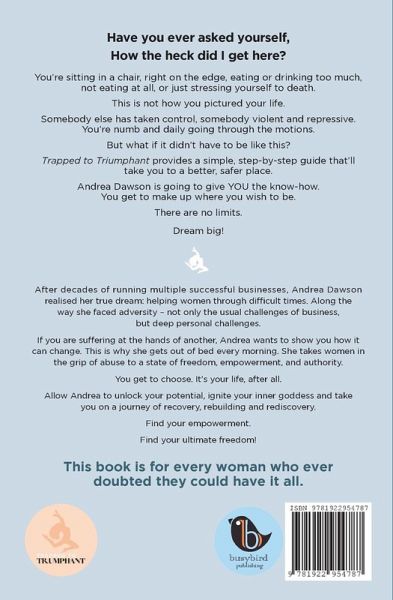 Have you ever asked yourself,How the heck did I get here? You're sitting in a chair, right on the edge, eating or drinking too much, not eating at all, or just stressing yourself to death. This is not how you pictured your life. Somebody else has taken control, somebody violent and repressive. You're numb and daily going through the motions. But what if it didn't have to be like this? Trapped to Triumphant provides a simple, step-by-step guide that'll take you to a better, safer place. Andrea Dawson is going to give YOU the know-how. You get to make up where you wish to be. There are no limits. Dream big!