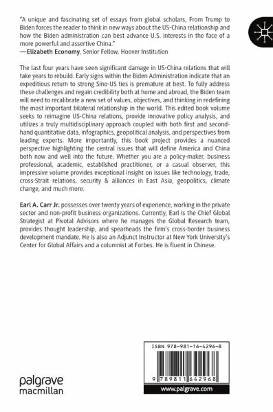 The last four years have seen significant damage in US-China relations that will take years to rebuild. Early signs within the Biden Administration indicate that an expeditious return to strong Sino-US ties is premature at best. To fully address these challenges and regain credibility both at home and abroad, the Biden team will need to recalibrate a new set of values, objectives, and thinking in redefining the most important bilateral relationship in the world. This edited book volume seeks to reimagine US-China relations, provide innovative policy analysis, and utilizes a truly multidisciplinary approach coupled with both first and second-hand quantitative data, infographics, geopolitical analysis, and perspectives from leading experts. More importantly, this book project provides a nuanced perspective highlighting the central issues that will define America and China both now and well into the future. Whether you are a policy-maker, business professional, academic, established practitioner, or a casual observer, this impressive volume provides exceptional insight on issues like technology, trade, cross-Strait relations, security & alliances in East Asia, geopolitics, climate change, and much more.