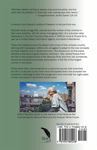 A memoir from Russia's bubble of freedom in the pre-Putin era. Michelle Carter at age fifty, married and the mother of two children in their early twenties, left her job as managing editor of a suburban daily newspaper in the San Francisco Bay area in 1995 to move to Russia for a year as a United States Information Agency Journalist-in-Residence. There she traveled across the eleven time zones of this complex country, working with newspaper editors who struggled to adapt to the new concepts of press freedom and a market economy. She became an on-the-scene witness to the second great Russian revolution. She viewed Russia from her flat on the embankment of the Moscow River and from her sometimes humorous shoulder-to-shoulder participation in the life of the largest country in the world. At the same time, she embarked on a personal journey that wrenched her life in a way she could never have anticipated when she accepted her husband's challenge to take this assignment and culminate her eight years of work and travel in the former Soviet Union.