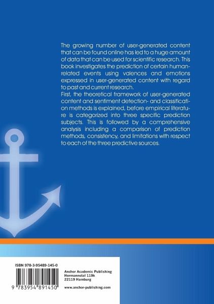 The growing number of user-generated content that can be found online has led to a huge amount of data that can be used for scientific research. This book investigates the prediction of certain human-related events using valences and emotions expressed in user-generated content with regard to past and current research. First, the theoretical framework of user-generated content and sentiment detection- and classification methods is explained, before empirical literature is categorized into three specific prediction subjects. This is followed by a comprehensive analysis including a comparison of prediction methods, consistency, and limitations with respect to each of the three predictive sources.