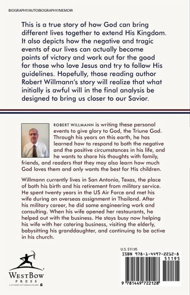 This is a true story of how God can bring different lives together to extend His Kingdom. It also depicts how the negative and tragic events of our lives can actually become points of victory and work out for the good for those who love Jesus and try to follow His guidelines. Hopefully, those reading author Robert Willmann's story will realize that what initially is awful will in the final analysis be designed to bring us closer to our Savior.