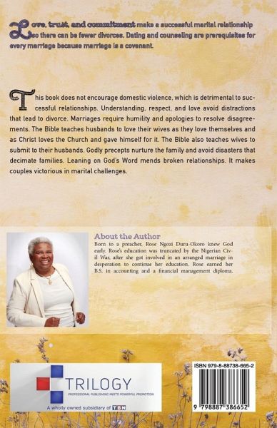 Love, trust, and commitment make a successful marital relationship so there can be fewer divorces. Dating and counseling are prerequisites for every marriage because marriage is a covenant. This book does not encourage domestic violence, which is detrimental to successful relationships. Understanding, respect, and love avoid distractions that lead to divorce. Marriages require humility and apologies to resolve disagreements. The Bible teaches husbands to love their wives as they love themselves and as Christ loves the Church and gave himself for it. The Bible also teaches wives to submit to their husbands. Godly precepts nurture the family and avoid disasters that decimate families. Leaning on God's Word mends broken relationships. It makes couples victorious in marital challenges.