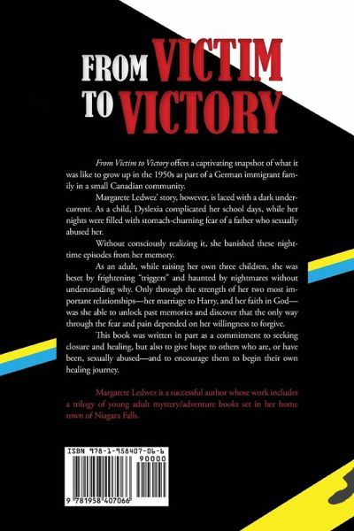 "From Victim to Victory" offers a captivating snapshot of what it was like to grow up in the 1950s as part of a German immigrant family in a small Canadian community. Margarete Ledwez' story, however, is laced with a dark undercurrent. As a child, Dyslexia complicated her school days, while her nights were filled with stomach-churning fear of a father who sexually abused her. Without consciously realizing it, she banished these nighttime episodes from her memory. As an adult, while raising her own three children, she was beset by frightening "triggers" and haunted by nightmares without understanding why. Only through the strength of her two most important relationships-her marriage to Harry, and her faith in God-was she able to unlock past memories and discover that the only way through the fear and pain depended on her willingness to forgive. This book was written in part as a commitment to seeking closure and healing, but also to give hope to others who are, or have been, sexually abused-and to encourage them to begin their own healing journey. Margarete Ledwez is a successful author whose work includes a trilogy of young adult mystery/adventure books set in her hometown of Niagara Falls.