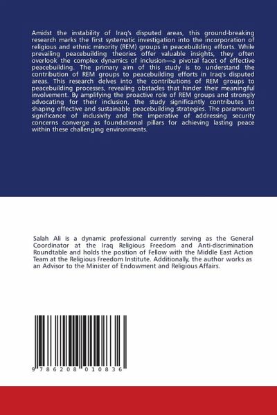 Amidst the instability of Iraq's disputed areas, this ground-breaking research marks the first systematic investigation into the incorporation of religious and ethnic minority (REM) groups in peacebuilding efforts. While prevailing peacebuilding theories offer valuable insights, they often overlook the complex dynamics of inclusion-a pivotal facet of effective peacebuilding. The primary aim of this study is to understand the contribution of REM groups to peacebuilding efforts in Iraq's disputed areas. This research delves into the contributions of REM groups to peacebuilding processes, revealing obstacles that hinder their meaningful involvement. By amplifying the proactive role of REM groups and strongly advocating for their inclusion, the study significantly contributes to shaping effective and sustainable peacebuilding strategies. The paramount significance of inclusivity and the imperative of addressing security concerns converge as foundational pillars for achieving lasting peace within these challenging environments.