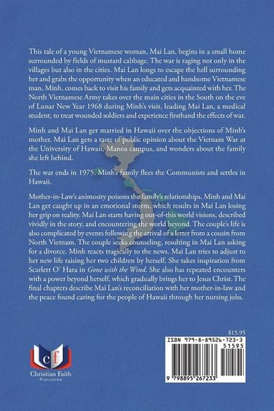 This tale of a young Vietnamese woman, Mai Lan, begins in a small home surrounded by fields of mustard cabbage. The war is raging not only in the villages but also in the cities. Mai Lan longs to escape the hell surrounding her and grabs the opportunity when an educated and handsome Vietnamese man, Minh, comes back to visit his family and gets acquainted with her. The North Vietnamese Army takes over the main cities in the South on the eve of Lunar New Year 1968 during Minh's visit, leading Mai Lan, a medical student, to treat wounded soldiers and experience firsthand the effects of war. Minh and Mai Lan get married in Hawaii over the objections of Minh's mother. Mai Lan gets a taste of public opinion about the Vietnam War at the University of Hawaii, Manoa campus, and wonders about the family she left behind. The war ends in 1975. Minh's family flees the Communists and settles in Hawaii. Mother-in-Law's animosity poisons the family's relationships. Minh and Mai Lan get caught up in an emotional storm, which results in Mai Lan losing her grip on reality. Mai Lan starts having out-of-this world visions, described vividly in the story, and encountering the world beyond. The couple's life is also complicated by events following the arrival of a letter from a cousin from North Vietnam. The couple seeks counseling, resulting in Mai Lan asking for a divorce. Minh reacts tragically to the news. Mai Lan tries to adjust to her new life raising her two children by herself. She takes inspiration from Scarlett O' Hara in Gone with the Wind. She also has repeated encounters with a power beyond herself, which gradually brings her to Jesus Christ. The final chapters describe Mai Lan's reconciliation with her mother-in-law and the peace found caring for the people of Hawaii through her nursing jobs.