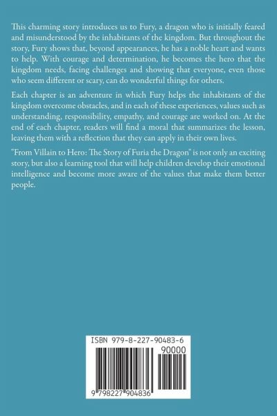 Dear parents and lovers of children's books, Are you looking for a story that inspires your children to be better people, that makes them dream and at the same time teaches them essential values? We have the perfect book for you: "From Villain to Hero: The Story of Fury the Dragon." This charming story introduces us to Fury, a dragon who is initially feared and misunderstood by the inhabitants of the kingdom. But throughout the story, Fury shows that, beyond appearances, he has a noble heart and wants to help. With courage and determination, he becomes the hero that the kingdom needs, facing challenges and showing that everyone, even those who seem different or scary, can do wonderful things for others. Each chapter is an adventure in which Fury helps the inhabitants of the kingdom overcome obstacles, and in each of these experiences, values ¿¿such as understanding, responsibility, empathy, and courage are worked on. At the end of each chapter, readers will find a moral that summarizes the lesson, leaving them with a reflection that they can apply in their own lives. "From Villain to Hero: The Story of Furia the Dragon" is not only an exciting story, but also a learning tool that will help children develop their emotional intelligence and become more aware of the values that make them better people. Why your child will love this story: Loveable characters: Furia is an unforgettable dragon, who goes from being a feared villain to a beloved hero. His transformation teaches children the importance of not judging without knowing and of always giving a second chance. Adventures full of excitement and learning: Each chapter is a new adventure that captures the attention of the little ones, keeping them interested while they learn fundamental values. Morals that teach values: At the end of each chapter, a moral helps reinforce the learning, leaving a clear and useful lesson for daily life. If you're looking for a book that offers your children more than just entertainment, "From Villain to Hero: The Story of Fury the Dragon" is the ideal choice. Allow them to dream, to learn, and to discover the magic of being a real hero in real life. Get your copy today and let Fury inspire your child on every page.
