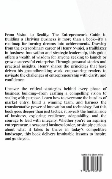 From Vision to Reality: The Entrepreneur's Guide to Building a Thriving Business is a compelling blueprint for entrepreneurs at any stage of their journey. Through the lens of Henry Nwajei's remarkable career, this book offers an intimate look at the principles and strategies that have powered his groundbreaking ventures, including BizMaster. Blending real-world experiences with actionable insights, it takes readers through the core stages of building a business-from cultivating a vision to navigating the complexities of market entry, team building, and innovation. Henry's journey exemplifies the resilience, adaptability, and courage required to lead with integrity and achieve sustained success. More than just a guidebook, this is a celebration of the human side of entrepreneurship. With its rich blend of personal anecdotes, strategic frameworks, and practical wisdom, From Vision to Reality empowers readers to turn obstacles into opportunities and ideas into tangible outcomes. Whether you're launching your first startup, revitalizing an existing business, or exploring new strategies for growth, this book offers the inspiration and tools to help you build a thriving, future-proof enterprise.
