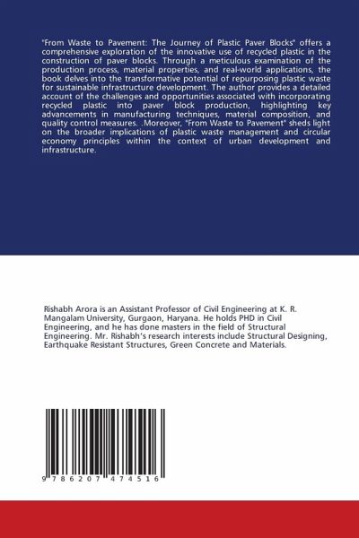 "From Waste to Pavement: The Journey of Plastic Paver Blocks" offers a comprehensive exploration of the innovative use of recycled plastic in the construction of paver blocks. Through a meticulous examination of the production process, material properties, and real-world applications, the book delves into the transformative potential of repurposing plastic waste for sustainable infrastructure development. The author provides a detailed account of the challenges and opportunities associated with incorporating recycled plastic into paver block production, highlighting key advancements in manufacturing techniques, material composition, and quality control measures. .Moreover, "From Waste to Pavement" sheds light on the broader implications of plastic waste management and circular economy principles within the context of urban development and infrastructure.