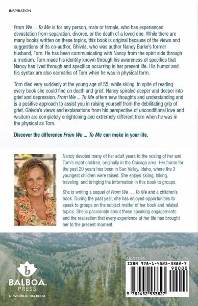 From We.... To Me is for any person, male or female, who has experienced devastation from separation, divorce, or the death of a loved one. While there are many books written on these topics, this book is original because of the views and suggestions of its co-author, Ghivda, who was author Nancy Burke's former husband, Tom. He has been communicating with Nancy from the spirit side through a medium. Tom made his identity known through his awareness of specifics that Nancy has lived through and specifics occurring in her present life. His humor and his syntax are also earmarks of Tom when he was in physical form. Tom died very suddenly at the young age of 55, while skiing. In spite of reading every book she could find on death and grief, Nancy spiraled deeper and deeper into grief and depression. From We.... To Me offers new thoughts and understanding and is a positive approach to assist you in raising yourself from the debilitating grip of grief. Ghivda's views and explanations from his perspective of unconditional love and wisdom are completely enlightening and extremely different from when he was in the physical as Tom. Discover the difference From We ... To Me can make in your life.