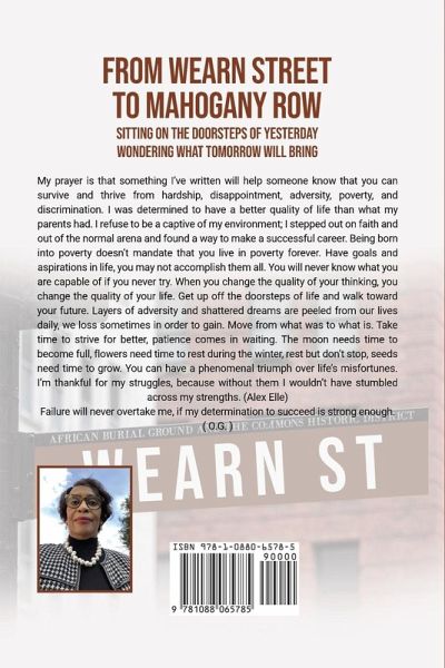 My prayer is that something I've written will help someone know that you can survive and thrive from hardship, disappointment, adversity, poverty, and discrimination. I was determined to have a better quality of life than what my parents had. I refuse to be a captive of my environment; I stepped out on faith and out of the normal arena and found a way to make a successful career. Being born into poverty doesn't mandate that you live in poverty forever. Have goals and inspirations in life, you may not accomplish them all. You will never know what you are capable of if you never try. When you change the quality of your thinking, you change the quality of your life. Get up off the doorsteps of life and walk toward your future. Layers of adversity and shattered dreams are peeled from our lives daily, we lose sometimes in order to gain. Move from what was to what is. Take time to strive for better, patience comes in waiting. The moon needs time to become full, flowers need time to rest during the winter, rest but don't stop, and seeds need time to grow. You can have a phenomenal triumph over life's misfortunes. I'm thankful for my struggles because without them I wouldn't have stumbled across my strengths. (Alex Elle) Failure will never overtake me if my determination to succeed is strong enough. ( O.G. )